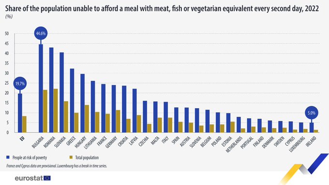 Τρίτοι από το τέλος στο κατά κεφαλήν εισόδημα στην ΕΕ το 2022, τρίτοι χειρότεροι στην ενεργειακή φτώχεια και τέταρτοι χειρότεροι σε πληθυσμό που δεν είναι σε θέση να εξασφαλίσει ένα γεύμα με κρέας, ψάρι ή λαχανικά κάθε δεύτερη ημέρα – με τους Έλληνες να μειώνονται καθημερινά, είτε επειδή δεν γενούν παιδιά μη έχοντας τη δυνατότητα να τα συντηρήσουν, είτε λόγω του ότι μεταναστεύουν για να επιβιώσουν.
